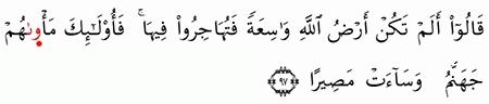 إ ن ال ذ ين ت و ف اه م ال م ل ائ ك ة ظ ال م ي أ ن ف س ه م ق ال وا ف يم ك ن ت م ق ال وا ك ن ا م س ت ض ع ف ين ف ي ال أ ر ض ق ال وا أ ل م ت ك ن أ ر ض الل ه و اس ع ة ف ت ه اج ر وا ف يه ا ف أ ول ئ ك م أ و اه م ج ه ن م و س اء ت
